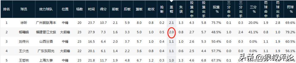 杨曦皓代表福建出战23场比赛,首发19场,场均得到27.9分钟的出场时间,交出7.3分5.0篮板1.0助攻2.0封盖,其中,2.0次封盖位居所有新秀球员最高,仅次于徐昕的2.1次,毫无疑问是一个非常出众的护框手。